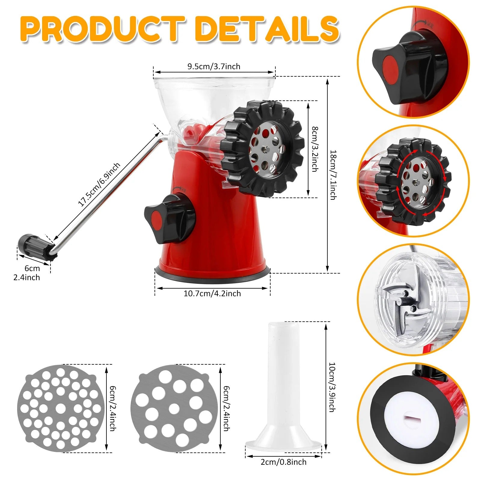 - [Food Grade and Wide Application] This manual meat grinder is made of premium plastic and metal that is food-grade and BPA-free. It is suitable for grinding meat, ginger, garlic, chili, and other ingredients.