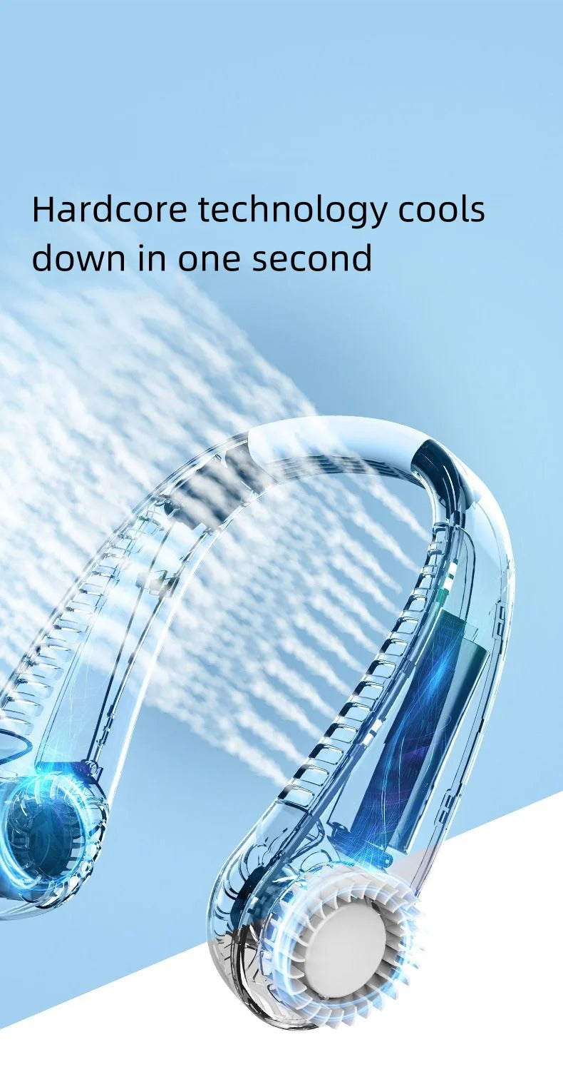 Our neck-hanging fan has excellent air pressurization technology and dual-channel air intake design, which greatly reduces the fan noise, which is lower than 36db. Brushless motor (quieter, more energy efficient). It runs with low noise and won't bother you, allowing you to experience it in a comfortable and quiet environment. The rechargeable neck fan adopts a bladeless design, you don't have to worry about your hair getting caught on the fan blades, very safe to use. It keeps you cool all the time.