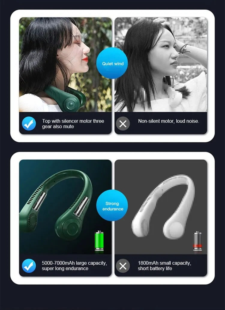 Our neck-hanging fan has excellent air pressurization technology and dual-channel air intake design, which greatly reduces the fan noise, which is lower than 36db. Brushless motor (quieter, more energy efficient). It runs with low noise and won't bother you, allowing you to experience it comfortably and quietly. The rechargeable neck fan adopts a bladeless design, you don't have to worry about your hair getting caught on the fan blades, very safe to use. It keeps you cool all the time.