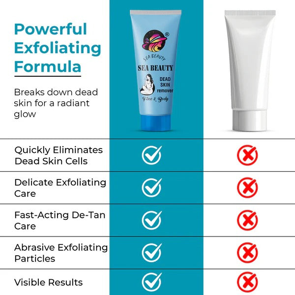 The Sea Beauty Dead Skin Remover is a gel-based exfoliator designed to remove dead skin, dirt, and oil, as well as stubborn tan and uneven skin tone. It is a gentle formula, suitable for all skin types, that helps reveal brighter, smoother, and more radiant skin without harshness. The product is easy to apply, works on the face, hands, and body, and leaves the skin feeling refreshed and rejuvenated.