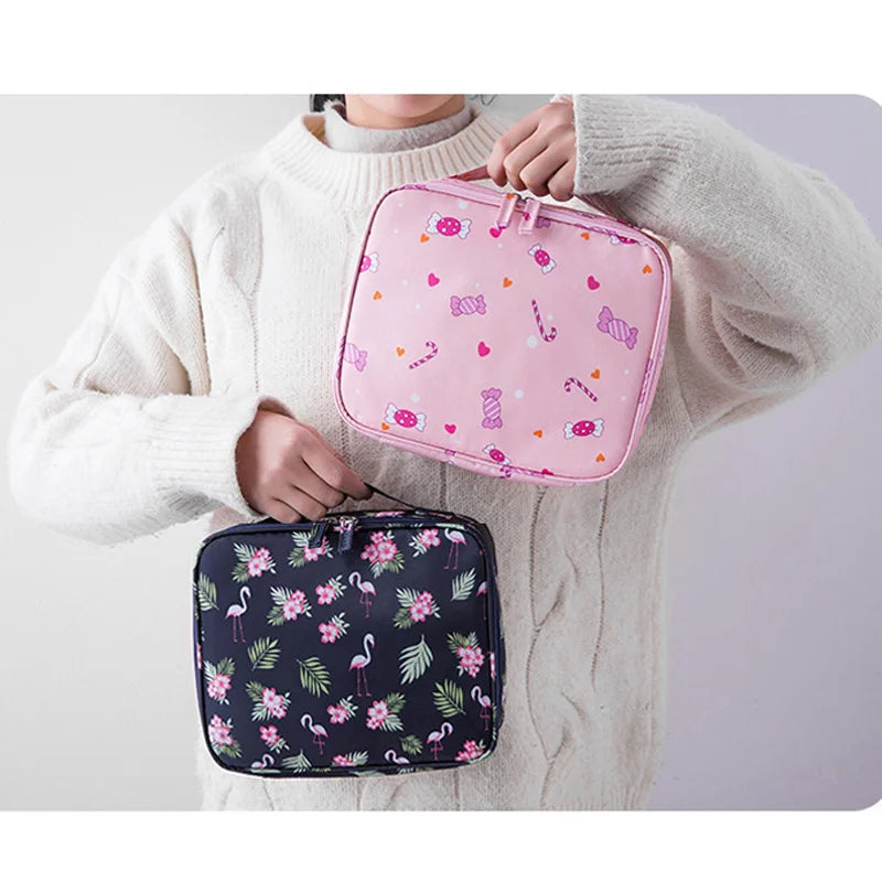 The travel makeup case can easily hold your facial cleanser, foundations, and other makeup products. When opened the cosmetic bag it expands to reveal three compartment(You can re-design your own compartment). When closed.